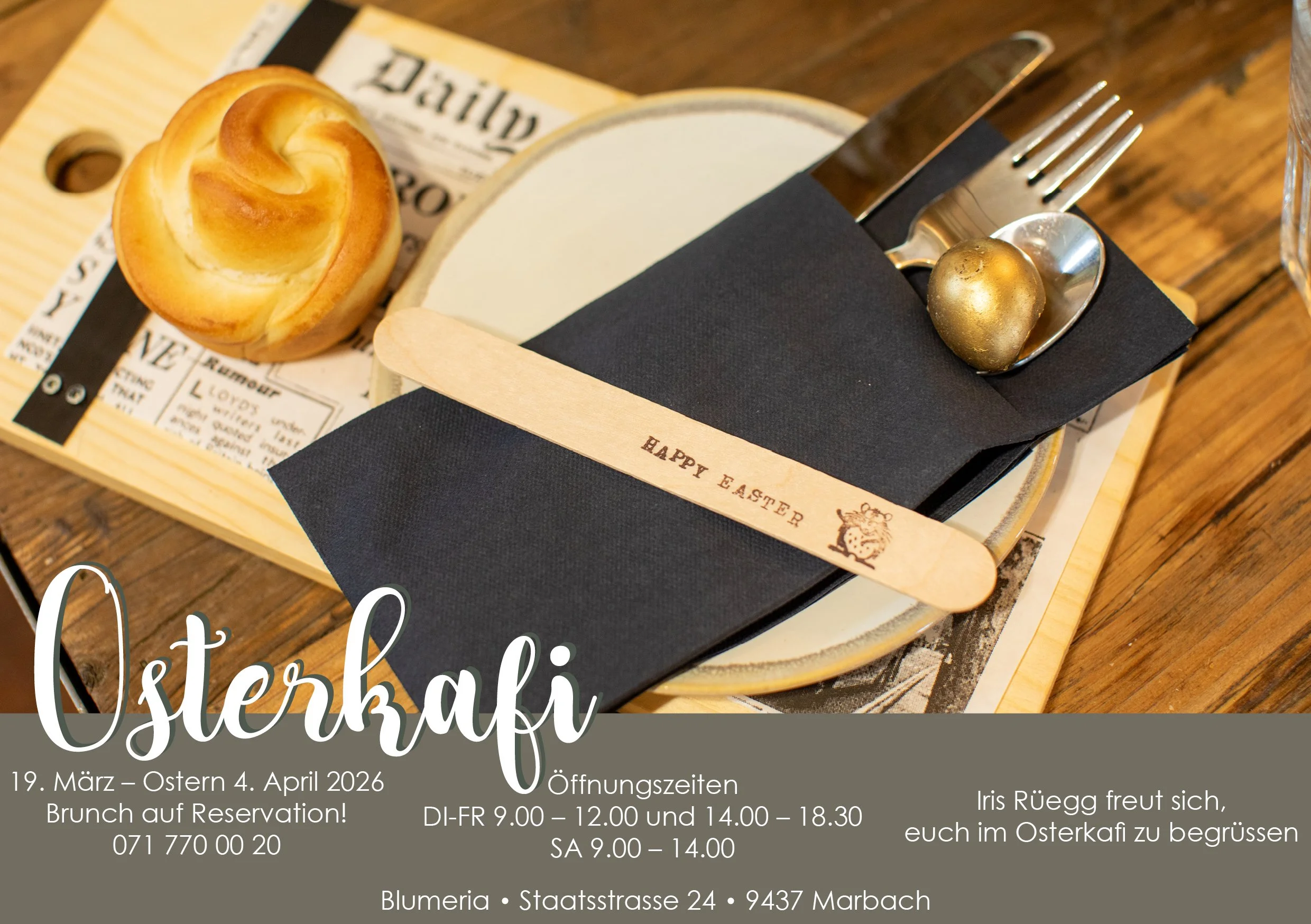 Unsere Vorbereitungen laufen und wir freuen uns mitzuteilen, dass es wieder ein kreatives Osterkafi gibt. Iris Rüegg verwöhnt euch am Vormittag wieder mit ihrem Brunch ( auf Voranmeldung) und am Nachmittag mit Kafi und Kuchen. Überrascht eure liebsten mit einem Ausflug zu uns, und geniesst es mit allen Sinnen. Die Frühlingsgefühle fürs Auge und die feinen Leckereien von Iris sind ein Perfect Match. Hast du schon reserviert? Den 3 Wochen sind schnell rum…..